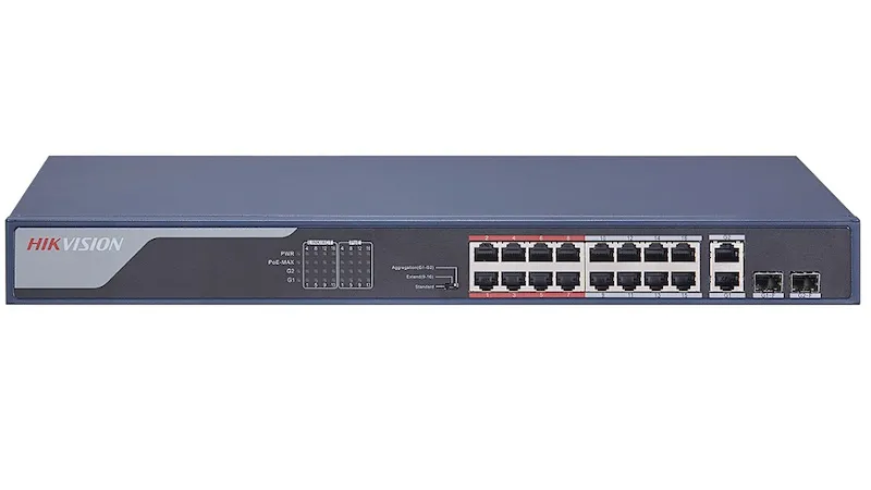 - Hikvision – Smart Managed, 16 10/100M RJ45 PoE ports, 2 Gigabit combo ports, 802.3af/at, PoE power budget 230W, Max. 300 meter long distance PoE transmission, Visualized Topology Management, Network Health Monitor, Real-Time Alarm Push and Video Control and Preview